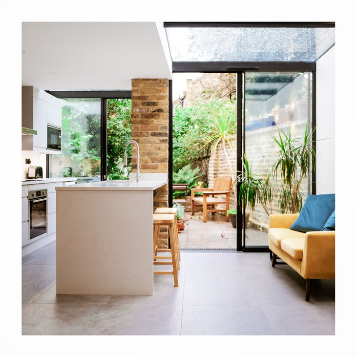 The once cramped kitchen, has now been transformed into a stunning modern space. It is enveloped in light and surrounded by glass, creating an expansive feel. Both glass extensions effortlessly slide open, connecting with the garden and patio. , blurring the boundaries between indoors and outdoors.