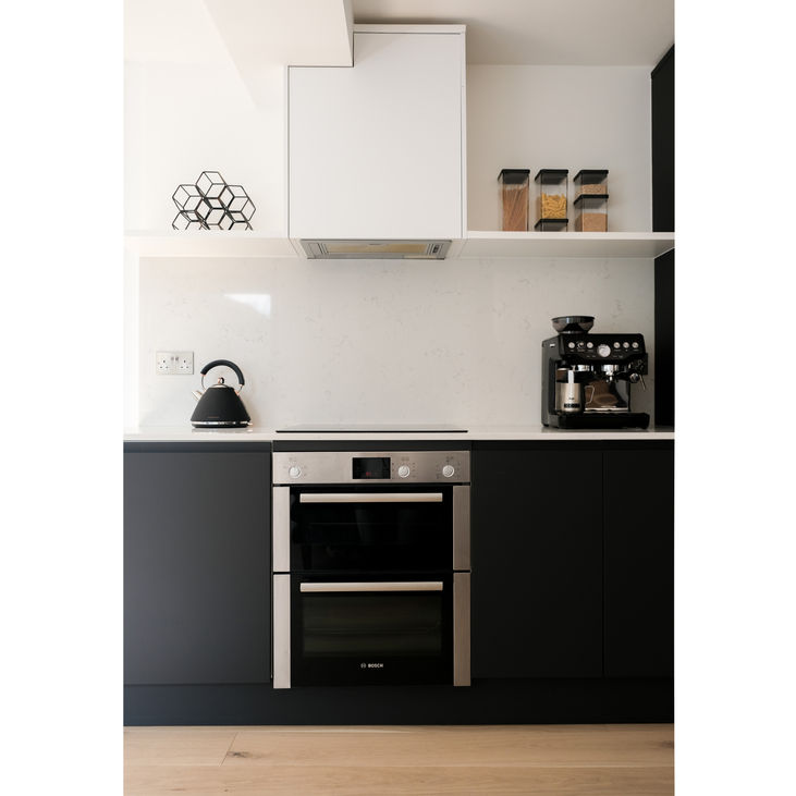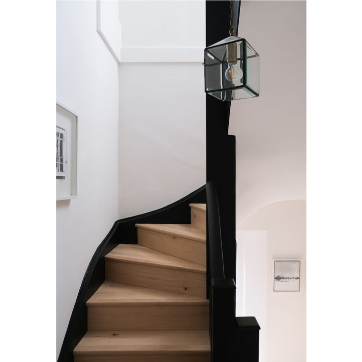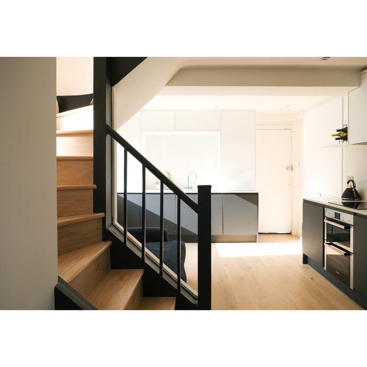 A bespoke kitchen has been cleverley designed to provide plentiful storage without compromising the size and flow of the space. The oak flooring continues and wraps up the staircase which rises all the way up the centre of the 3 storey apartment. Bifold doors to the living room connect the space into the small garden turning it into a fantastic space for living end entertaining. The ground floor living space flows from the kitchen, upwards trough the central staircase and also through the living room at the rear which opens up into the garden.