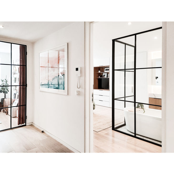 Across the hallway, the previous bathroom is transformed into a versatile study/guest room. Crittal glass doors connect this space to the wide hallway, brining light, airiness and flexibility to the room and hallway.