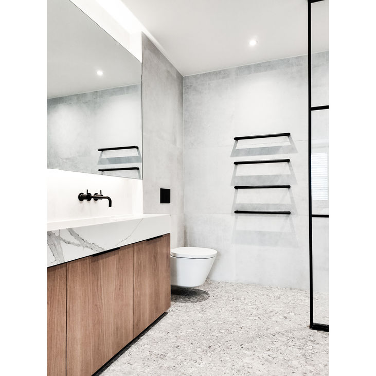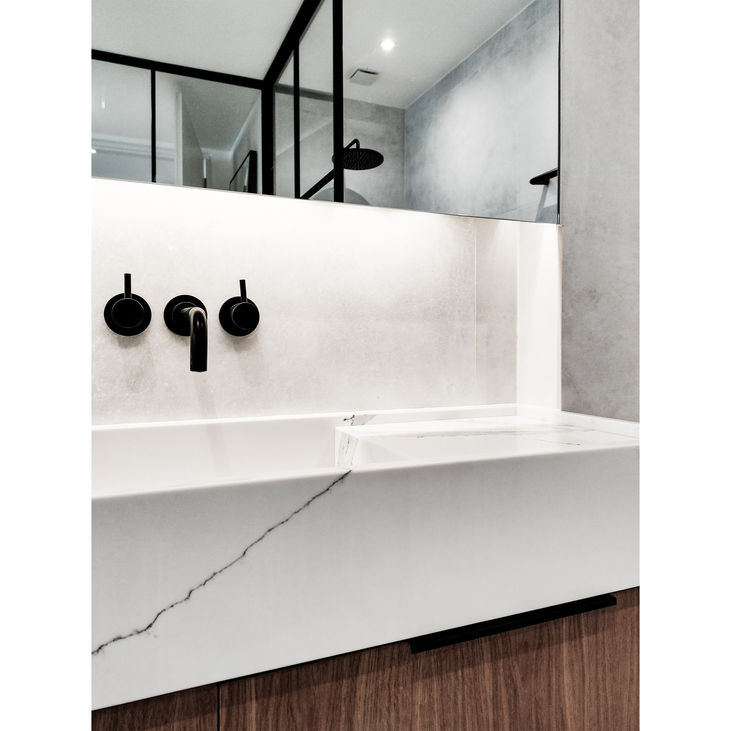 This project involves a beautiful contemporary London apartment. The centerpiece is the master bedroom, completely redesigned to incorporate a sleek walk-in ensuite. Crittal glass walls separate the sleeping area from the ensuite, showcasing a luxurious freestanding bath and walk-in shower. The bathroom is finished with stone, floating radiator bars and a bespoke marble sink sitting atop a floating oak vanity. Warmth is brought in through the use of natural oak throughout the bedroom furniture and flooring, creating a sense of balance.